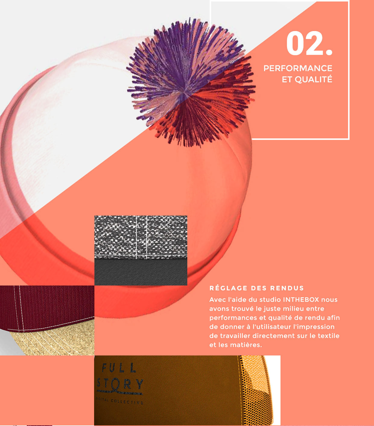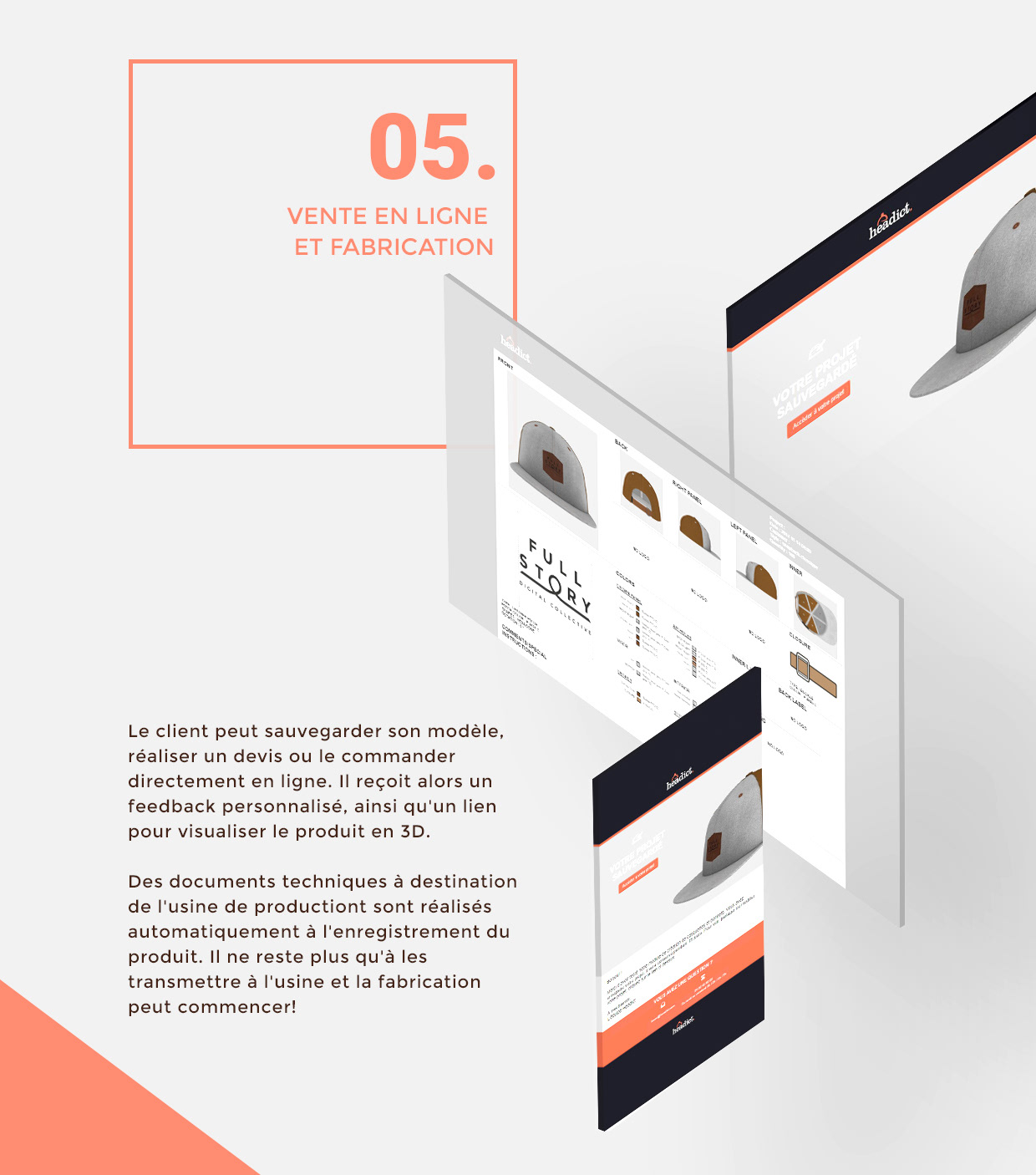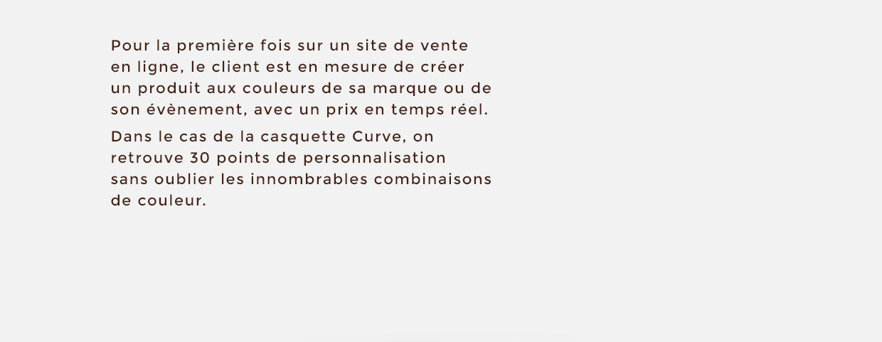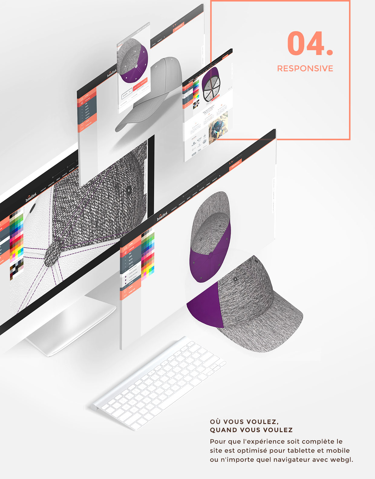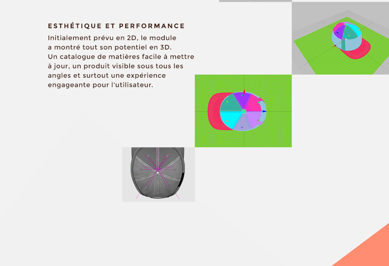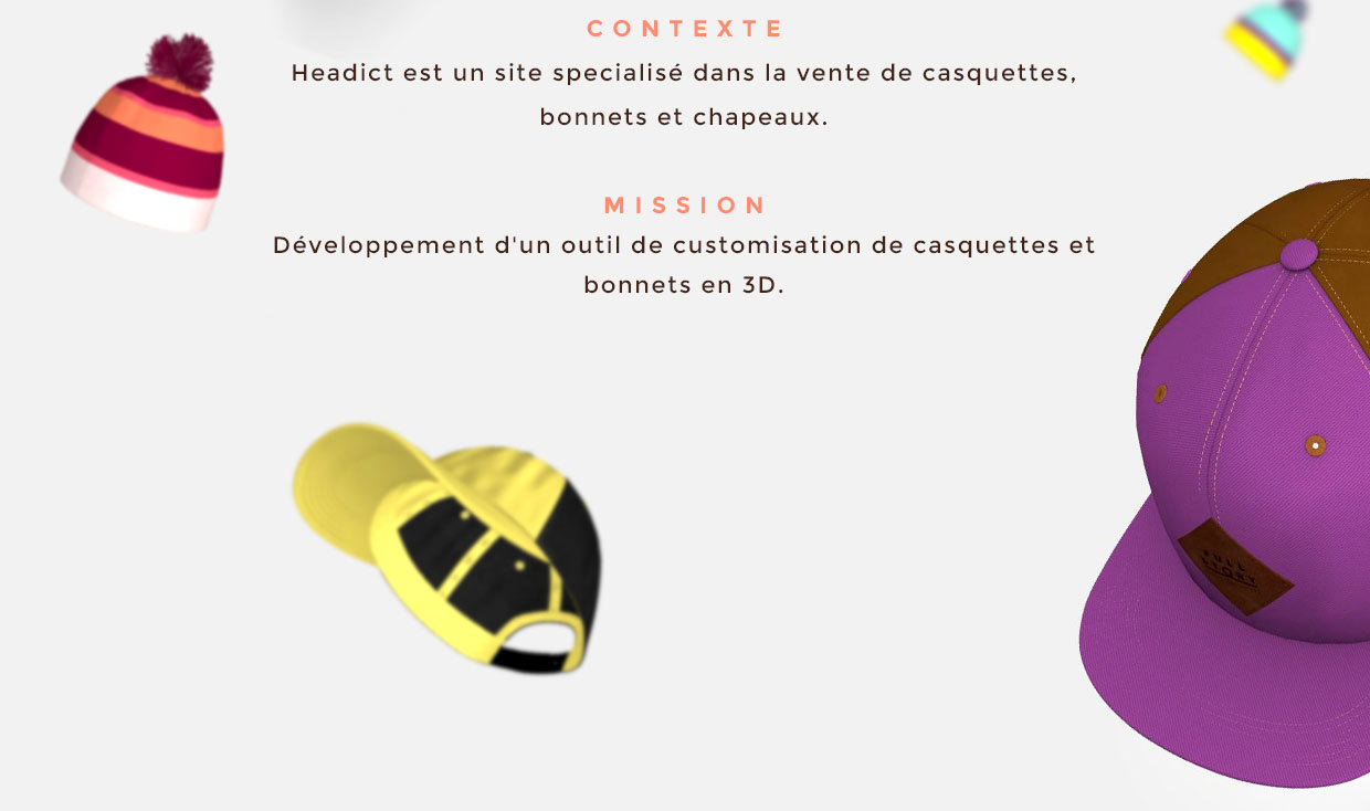 Développement d'un outils de customisation de casquettes et bonnets en 3D. Pour la première fois sur un site de vente en ligne, le client est en mesure de créer un produit aux couleurs de sa marque ou de son événement, avec un prix en temps réel.