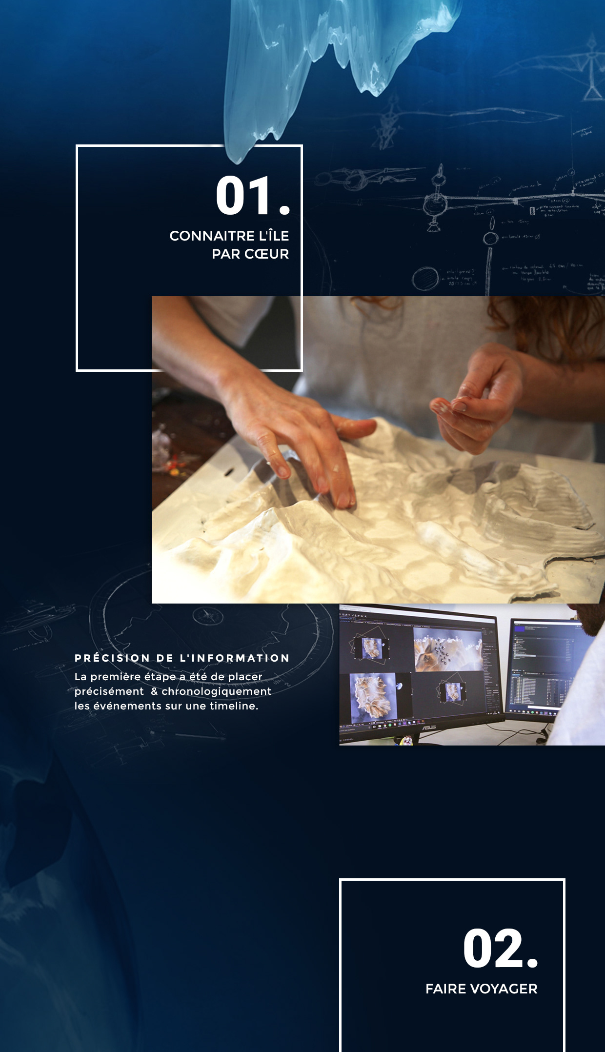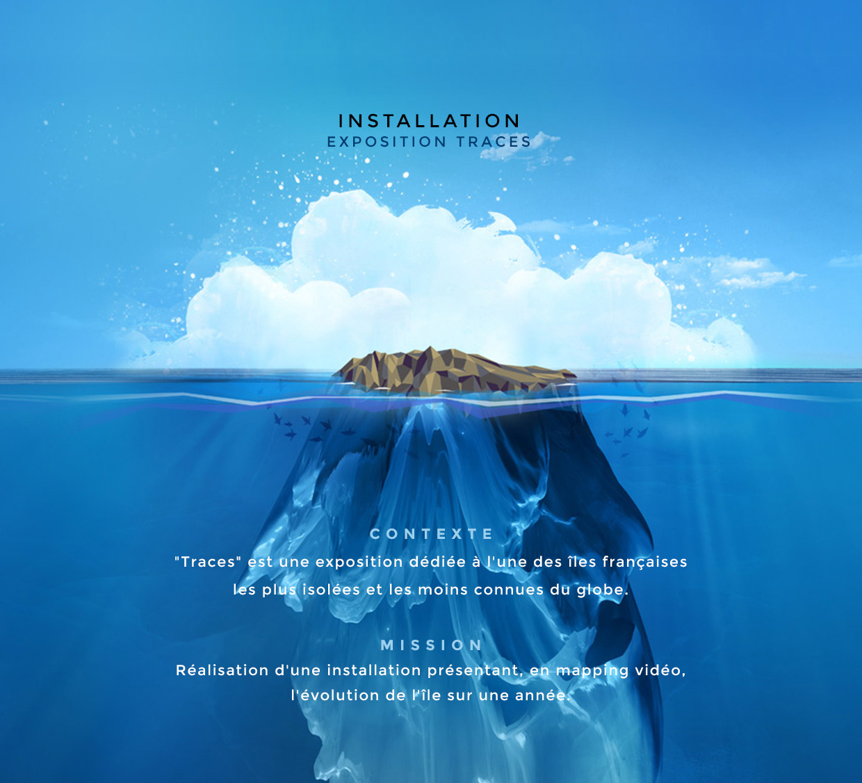 INSTALLATION IMMERSIVE Nathalie Cauvi raconte la genèse d’un projet artistique sur les terres australes et fait voyager le visiteur plus loin qu’il ne l’aurait cru au départ. En parallèle de ses créations, elle fit appel au collectif pour la réalisation d’une représentation augmentée de l’île de la possession. Nous avons donc représenté en motion design le comportement saisonnier de l’île, sa faune, sa météorologie ainsi que l’activité humaine que nous avons projeté sur un support en relief autour duquel le public peut circuler pour en découvrir tous les détails. Une bande son vient augmenter l’immersion, et un ventilateur synchronisé aux événements de la vidéo vient placer l’utilisateur au cœur de cette île cinglée par les vents.