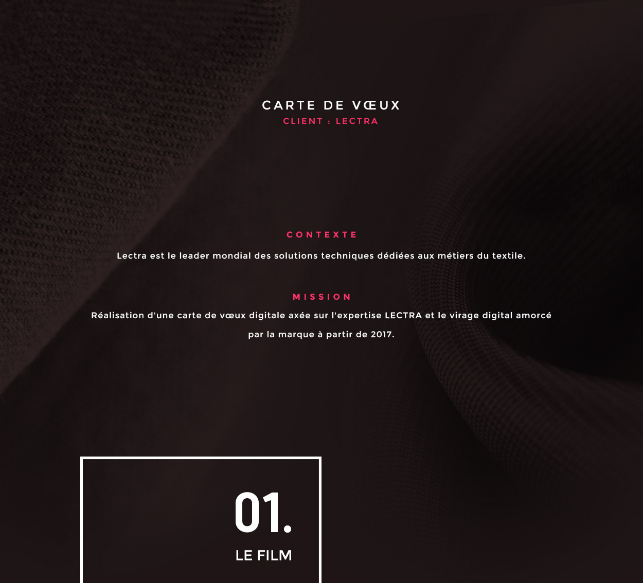 Réalisation d'une carte de vœux digitale axée sur l'expertise LECTRA, leader mondial des solutions techniques dédiées aux métiers du textile, et du virage digital amorcé par la marque à partir de 2017.
